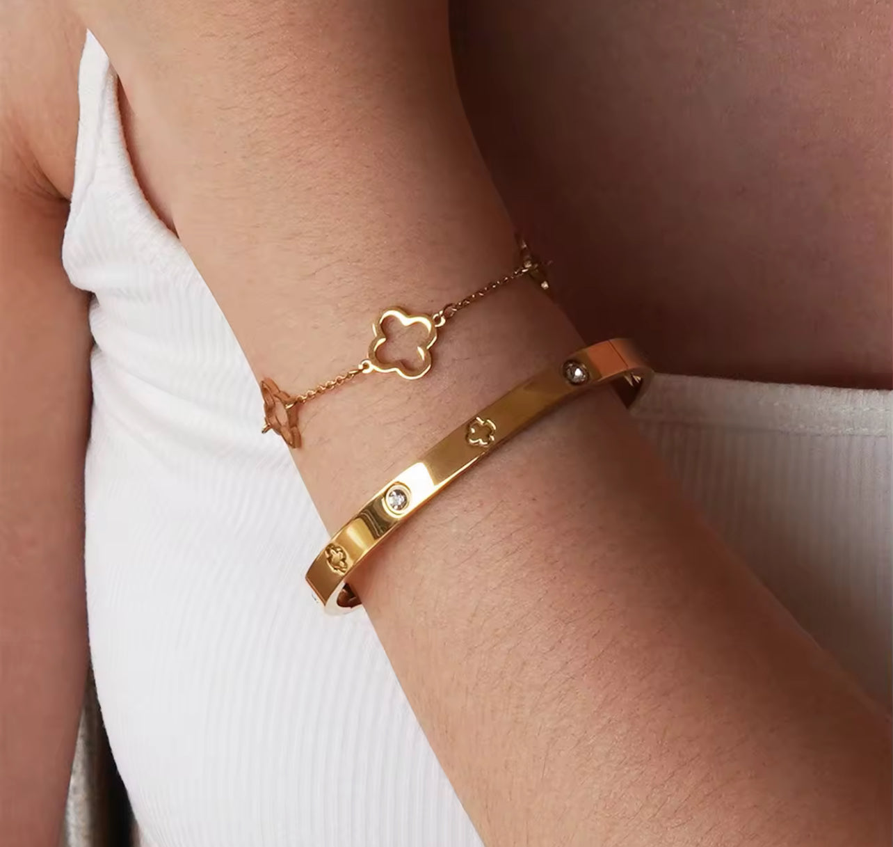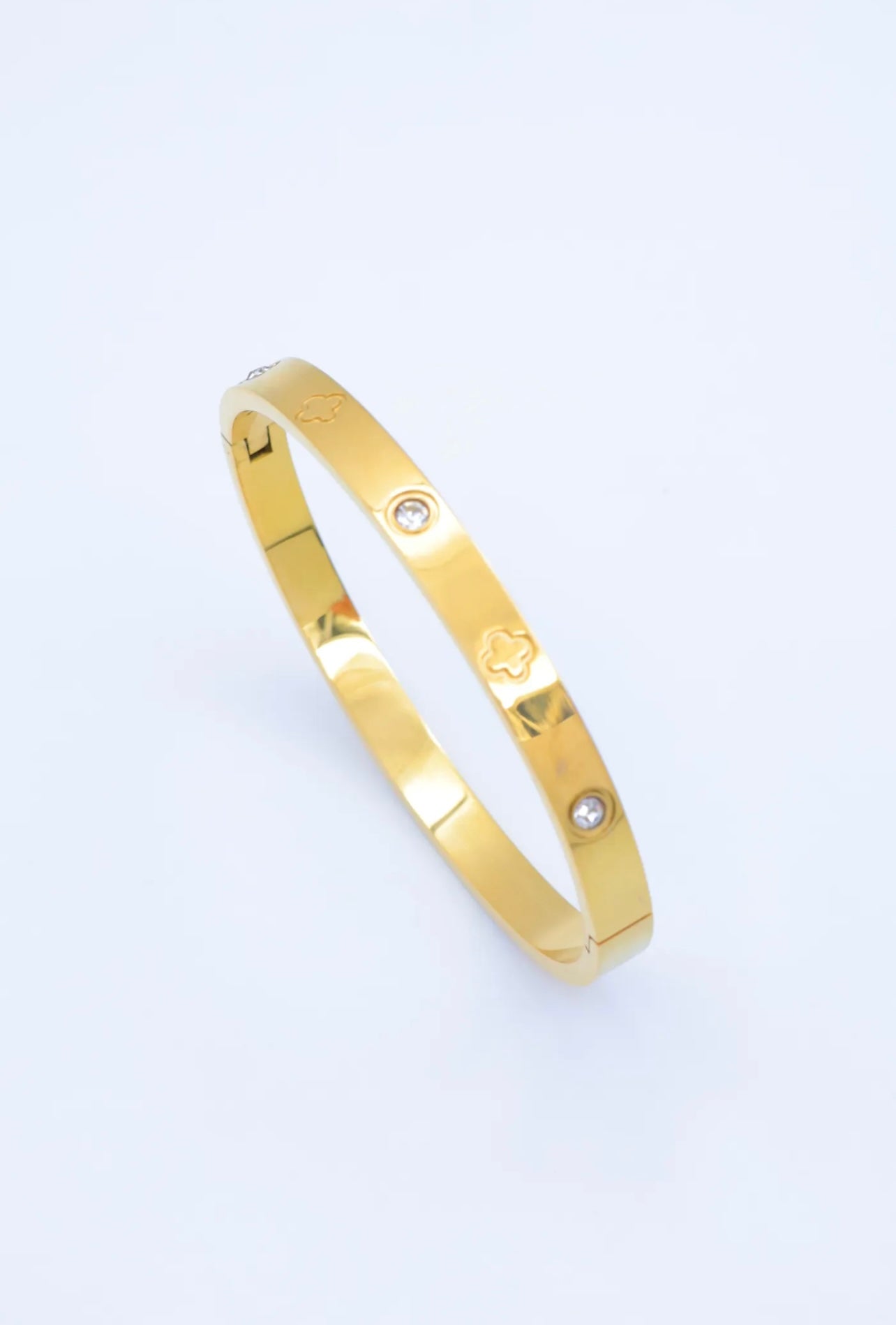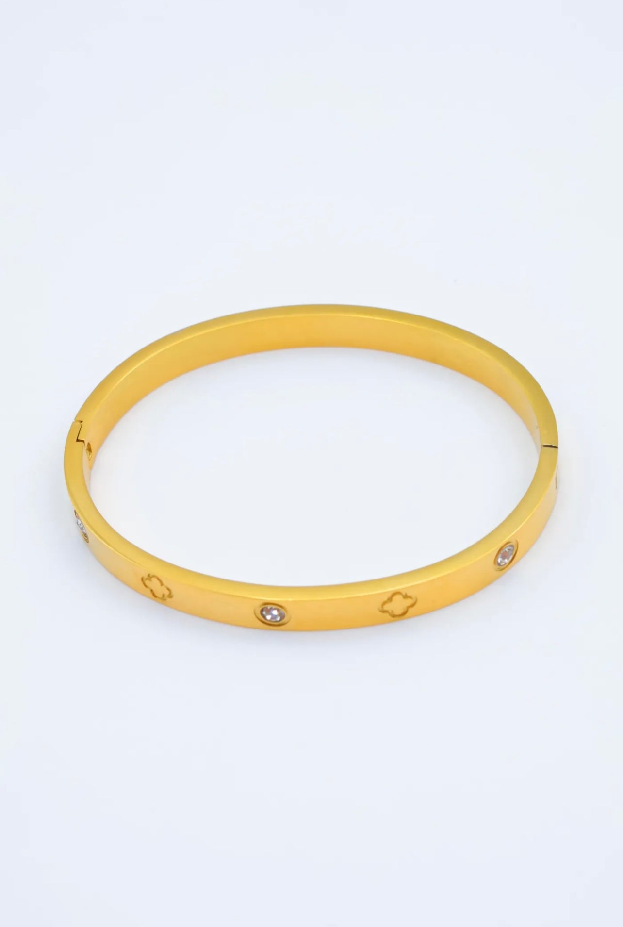 Élégant et intemporel, ce jonc doré en acier inoxydable est orné de strass scintillants et de motifs trèfle gravés pour une touche raffinée.